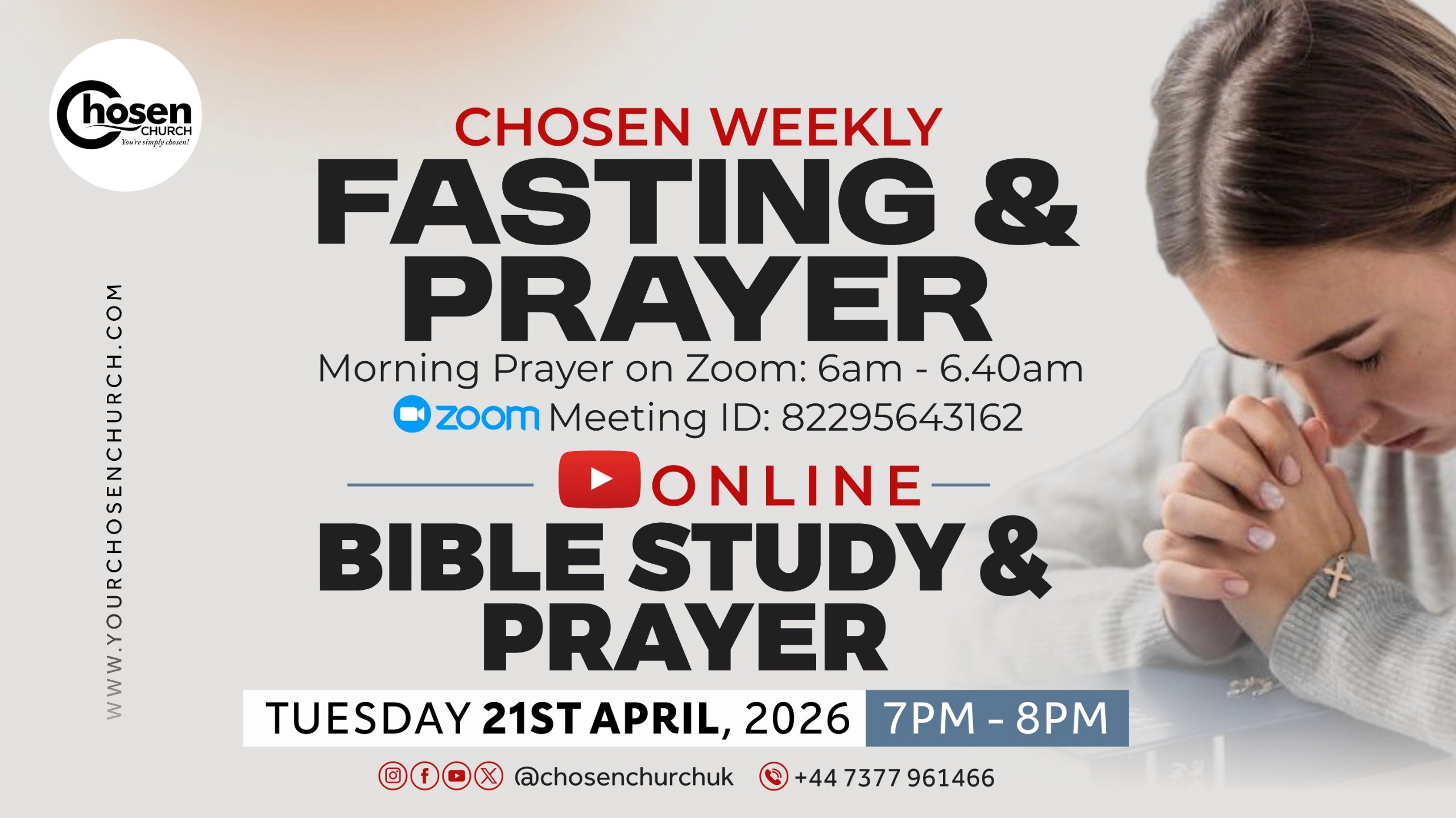 Join us for a time of Prayer every Tuesday by 6 am and Online Bible Study by 7 pm.